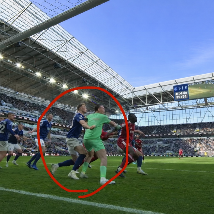 公推埃弗顿被范戴克100分钟绝杀,可惜!皮克福德准备出去摘球的时候这是被自己的后卫往后拽了一把?